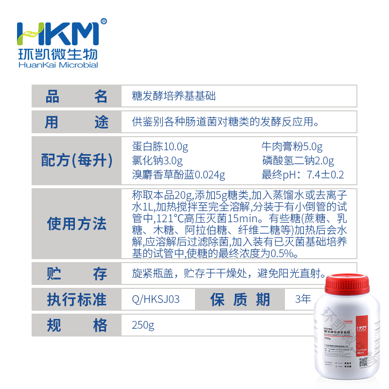 使用方法:称取本品20g,添加5g糖类,加入蒸馏水或去离子水或去离子水1 L,加热搅拌溶解煮沸至完全溶解,分装于有小倒管的试管中,121℃高压灭菌15min。有些糖(蔗糖、乳糖、木糖、阿拉伯糖、纤维二糖等)加热后会水解,应溶解后过滤除菌,加入装有已灭菌基础培养基的试管中,使糖的最终浓度为0.5%。(注:配制不同用量体积,可按比例扩增或缩小。)