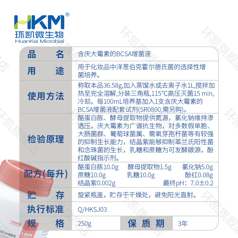 产品用途:用于化妆品中洋葱伯克霍尔德氏菌的选择性增菌培养。