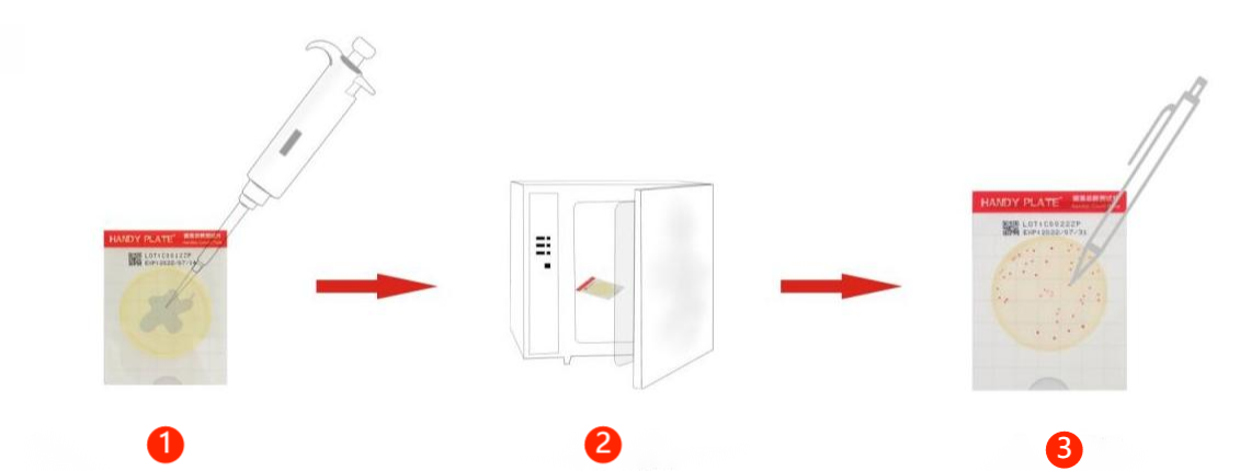 1、掀开透明薄膜,加入 1mL 样液接种在接种区中央,盖上薄膜。 2、培养(根据相应条件行培养) 3、判读(肉眼直接计算典型特征菌落,也可借助放大镜或菌落计数器等) |
