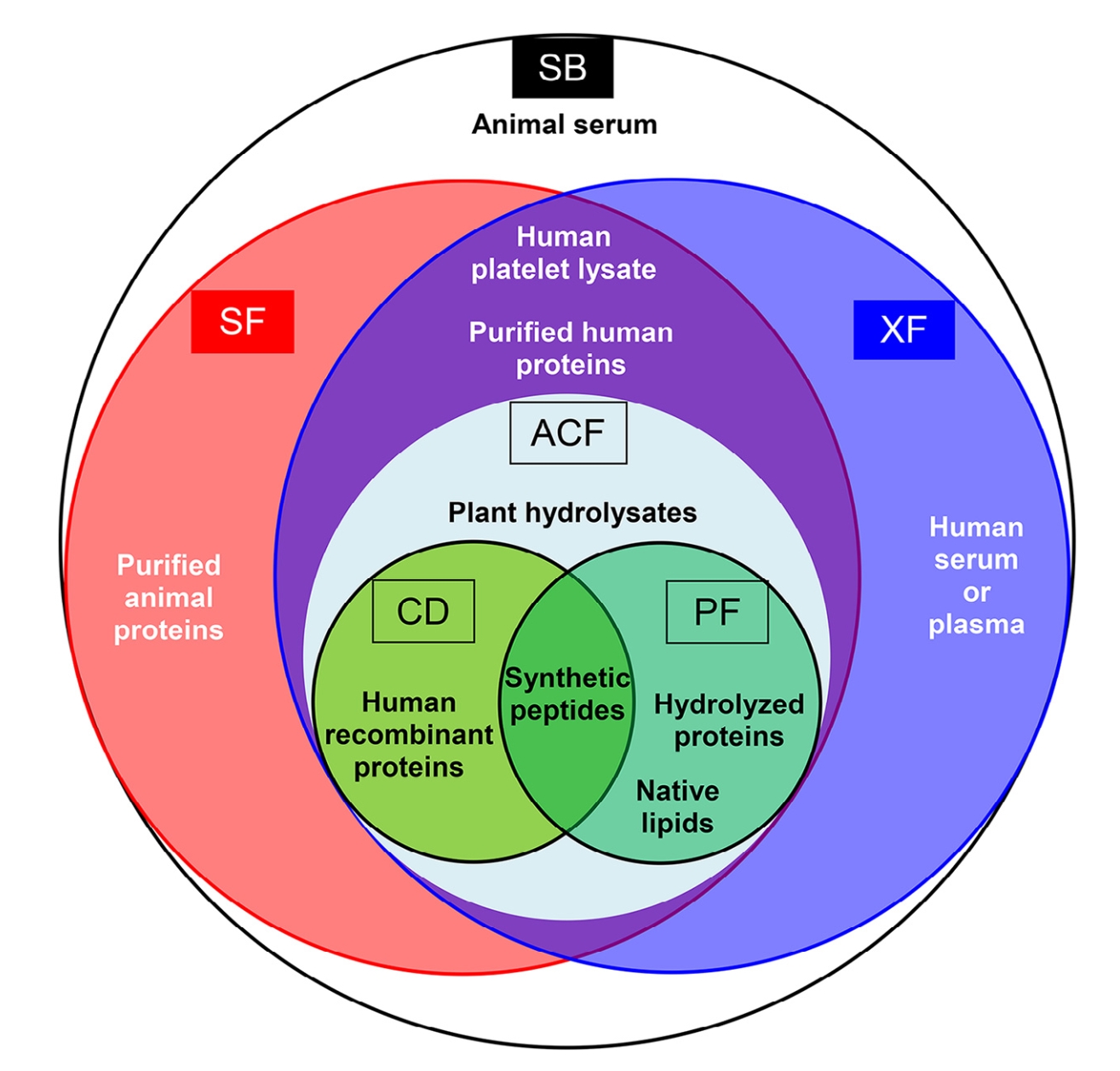 Animal derived component-free,ADCF | 1、培养基组成不含任何来自动物或人类的成分(例如动物/人类的血清&蛋白) | Plant hydrolysates | Animal component–free(ACF) |